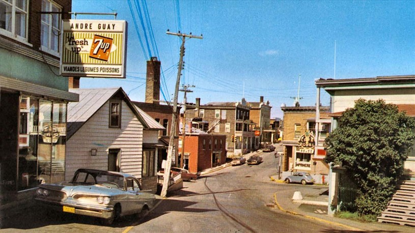 Sur la 4a photo, tout aussi remarquable c'est l'intersection de la 120e rue et la 2e avenue vers 1963. À gauche, l'épicerie d'André Guay. Plus loin à l'intersection, l'immeuble en briques brunes est la fameuse pharmacie Poliquin. Et après, les hôtels Continental (affiche rouge de Coke), puis Le National. À droite on voit l'annonce du Café Royal. Sur le coin de rue opposé, une affiche d'imprimerie dans l'édifice d'A.S. (Adalbert) Paquet.