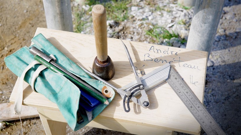 Par ailleurs, la technique de création de l’artiste pour cette œuvre nécessite un outillage particulier. En effet, celui-ci fait usage d’une massette portugaise pour définir précisément ses symboles sur le marbre. Ayant la forme d’un demi-œuf, l’outil en question permet de frapper plus fort sur un seul point. Si le sculpteur rate son coup, la massette roule sur le poignet évitant ainsi les blessures qu’un marteau conventionnel pourrait occasionner.