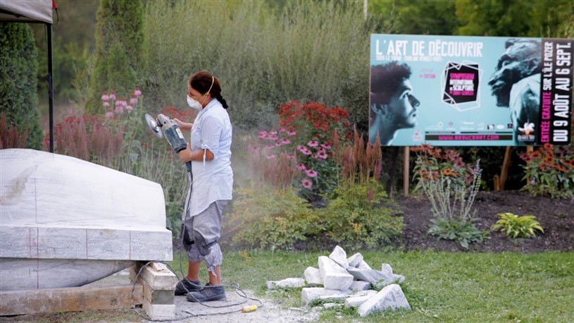 C’est sous le son des coups de marteau qui taillent le marbre et celui de la scie qui découpe la pierre que prend forme la pièce « Transcendance » de l’artiste-sculpteure originaire du Maroc Ikram Kabbaj.