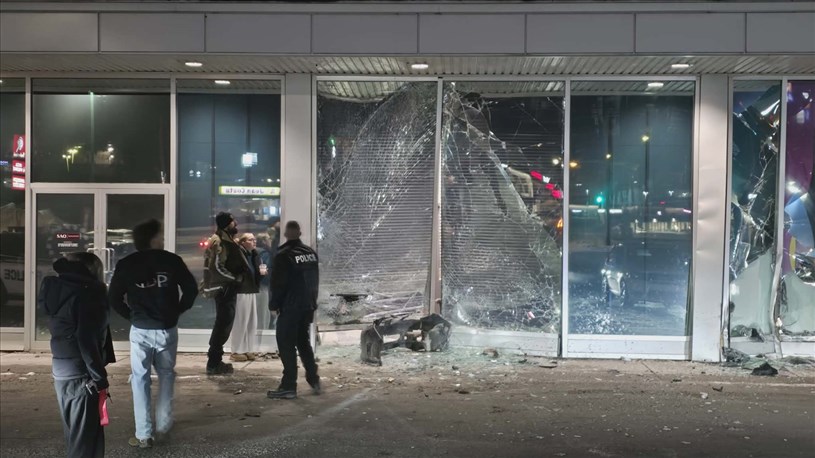 Au vu des marques au sol, un véhicule aurait perdu le contrôle après avoir réalisé des drifts pour ensuite terminer sa course dans plusieurs vitres de la succursale. Au total, trois vitres ont été brisées.