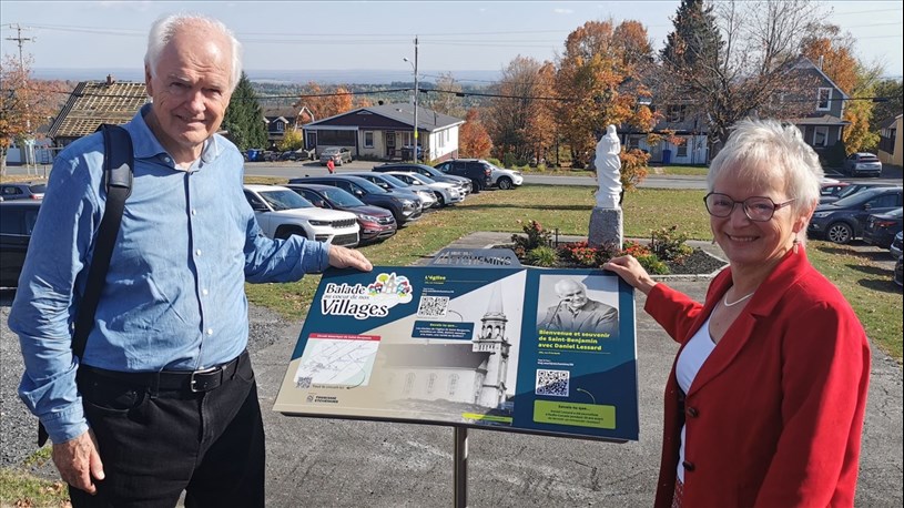 Une borne balado sur la vie de Daniel Lessard est également en fonction dans le village, tout juste en face de l'église. Pn voit l'illustre citoyen en compagnie de la mairesse, Céline Veilleux.