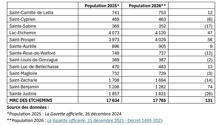 La MRC des Etchemins enregistre encore cette année une hausse de sa population, qui est passée de 17 634 habitants en 2025, à 17 765 individus en 2026.
