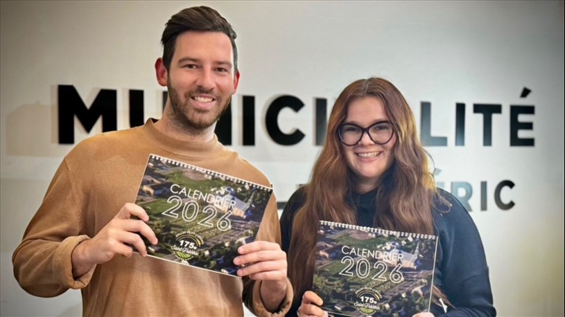 Le grand manitou des fêtes du 175e anniversaire de fondation de Saint-Frédéric, François Grenier-Gagné, en compagnie d'Alysson Paré, technicienne en loisirs de la Municipalité, qui agit comme coordonnatrice des événements, arborant le calendrier municipal, qui contient la programmation des festivités.