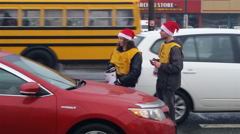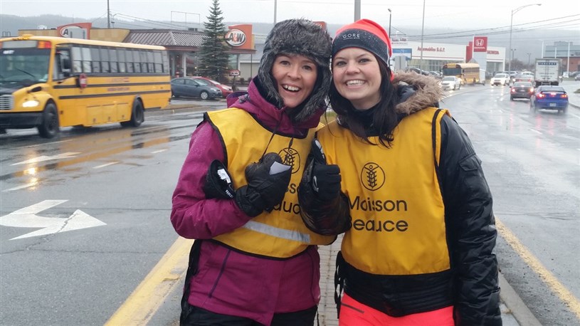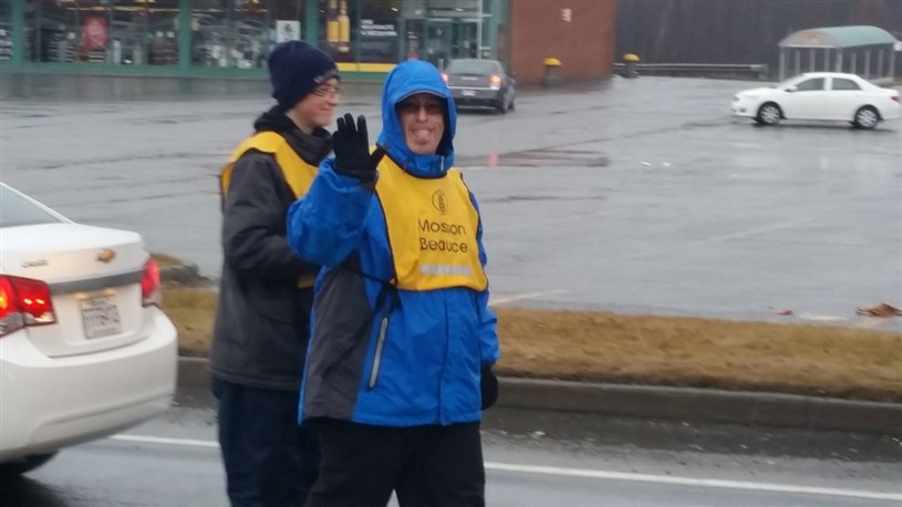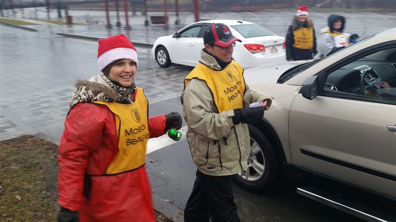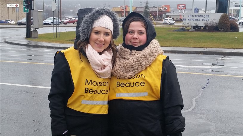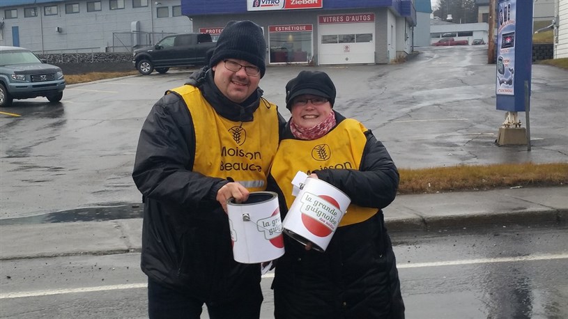 L'équipe d'EnBeauce.com était présente lors de la Guignolée au coin de la 90e Rue et du boulevard Lacroix. À gauche, Danny Paquet, conseillère publicitaire, en compagnie de Gabriel Gignac, journaliste.