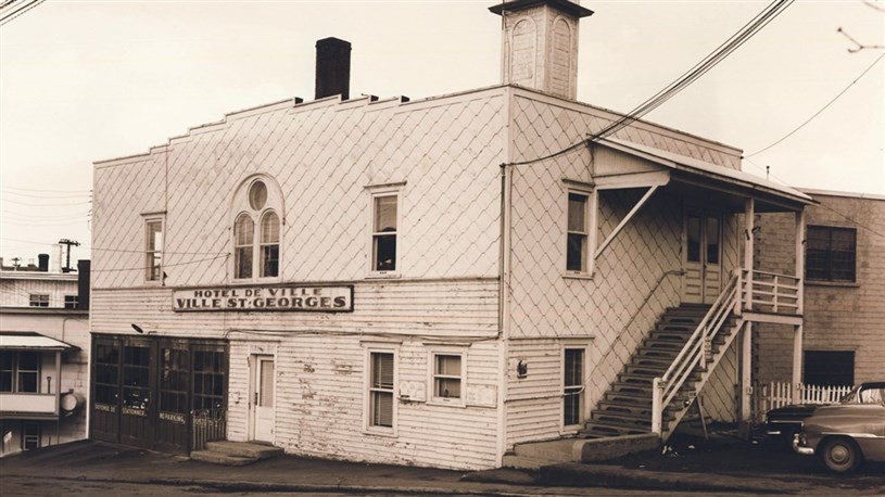 C'est en 1920-21 que fut construit le 1er hôtel de ville, sur la 2e Avenue, pas loin du ruisseau d'Ardoise. Le terrain fut acheté en 1919 de M. Johnny Lessard. La construction en fut confiée à M. Hormidas Poulin au prix de 6,600$, par contrat passé devant le notaire J.J. Lavoie. En plus de loger les bureaux de la municipalité, l'édifice servait aussi de caserne de pompiers et de poste de police. Derrière les grandes portes foncées étaient garés deux camions de pompiers, et derrière les camions, il y avait deux petites cellules pour incarcérer temporairement les malcommodes. Le 2e étage logeait la salle du conseil ainsi que les bureaux du chef de police Lucien Poulin et du secrétaire municipal Edmond Grenier. Le bureau de ce dernier donnait sur la fenêtre de droite au 2e étage. Remarquez la tour au dessus du bâtiment: À son sommet était installée une sirène d'alarme qu'on faisait retentir en cas d'incendie, pour convoquer les pompiers. On actionnait aussi cette sirène à midi pile à tous les jours, probablement surtout pour annoncer aux travailleurs qu'il était temps d'aller diner. La tour avait une autre utilité: on y suspendait les boyaux d'arrosage au moyen d'une poulie pour les faire sécher après chaque incendie. Dans cet immeuble se trouvait aussi un logement d'habitation qui fut longtemps occupé par le chef Poulin et sa famille dans les années '50 jusqu'en 1963.