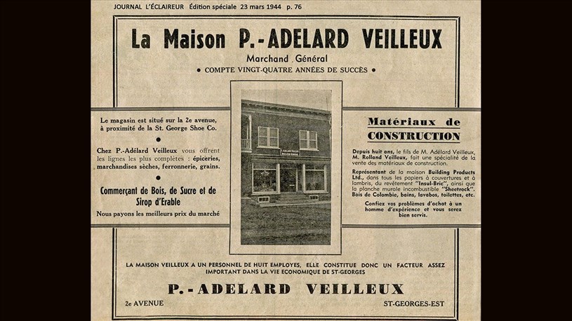 À quinze ans, Adélard Veilleux bûchait péniblement dans le bois dans le Maine. Il continua ainsi jusqu'à l'âge de 22 ans. Il revient à Saint-Georges en 1907 et devient commis chez Thomas Dallaire, marchand général sur la 1re avenue. Il y travailla pendant 5 ans et s'initia très vite au commerce. De 1912 à 1920, il devient commis chez un compétiteur, Joseph «le Boss» Gagnon, marchand général. En 1920, il part son propre commerce au centre-ville, dans l'ancien magasin d'Ephrem Poulin, près du pont. Malheureusement, l'édifice passe au feu le 27 avril 1921.