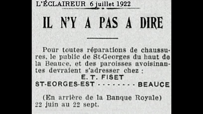 Ce n'est pas d'hier qu'on entend le nom de la cordonnerie Fiset, Vézina en parlait déjà dans son livre sur l'histoire de Saint-Georges publié en 1935. Même auparavant, dans une publicité parue en 1922, le premier Fiset qui s'est annoncé spécifiait que son atelier était «en arrière de la Banque Royale», c'était Thimotée (photo 3). Et finalement, dans les années '40, un autre du même nom a pris la relève, Jean-Jules Fiset. Il était le fils de Thimotée.