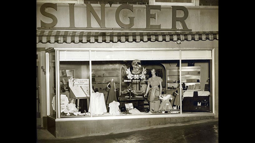 À Saint-Georges, le plus ancien magasin Singer dont nous avons des photos était situé sur la 2e avenue, voisin du restaurant Café Royal (photos 1 et 2, de 1953). Par la suite, il déménagea au 304 de la 1re avenue, pas très loin de la banque de Montréal. Il fut détruit par un incendie dévastateur survenu le 20 novembre 1957, en même temps que quatre autres commerces adjacents. Toutefois, c'est en septembre 1949 que Laurent Talbot ouvrit son premier magasin Singer sur la 1re avenue, au centre-ville (photo 3). Il faisait la vente et la réparations des machines à coudre. À cette époque, les vendeurs faisaient aussi du porte à porte dans les villages voisins pour aller offrir leurs produits directement chez les clientes. Beaucoup de mères de famille cousaient elles-mêmes leurs vêtements et ceux de leurs enfants. Elles avaient donc besoin d'une bonne machine à coudre.