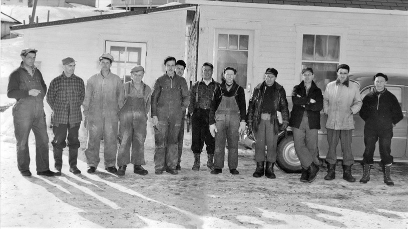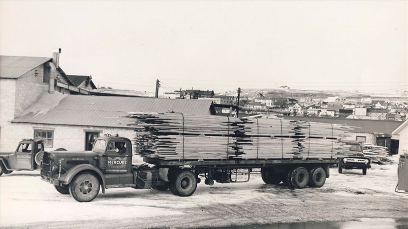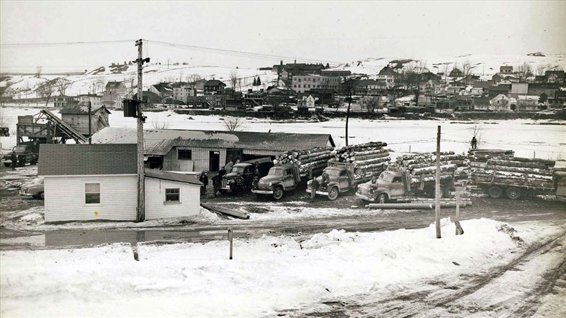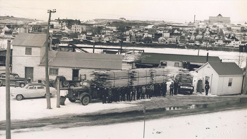 Ceux-ci acquirent ce moulin en 1943, et le modernisèrent. Ils effectuaient le débitage, le sciage, le rabotage et la préparation du bois pour toutes sortes d'usage. Voyez trois photos (1, 2 et 3) de l'extérieur en 1951 et deux autres de l'intérieur (4 et 5). Également leurs six camions en 1951 (photo 6). Or, en 1952, un important incendie détruisit leur scierie. Les Rancourt le reconstruisirent et en profitèrent pour renouveler tout l'équipement et mettre toutes les installations à l'électricité. Ils employaient de nombreux travailleurs, comme on les voit en 1953 en avant du gros camion chargé (photo 7), en plus de ceux montrés à la photo 6. Sans compter qu'il y avait aussi des camionneurs extérieurs qui faisaient parfois le transport du bois, comme M. Lionel Mercure de Plessisville (photo 8). Leurs principaux clients étaient les constructeurs d'immeubles et les manufacturiers de meubles dispersés un peu partout dans la province. Et en 1954, ils érigèrent en face, le long de la rivière, un gros édifice logeant leurs bureaux et des locaux pour les employés (photo 9, vers 1955). La toiture était lettrée à leur nom. Cet édifice est encore là, actuellement occupé par le commerce Décor Surface Veilleux.