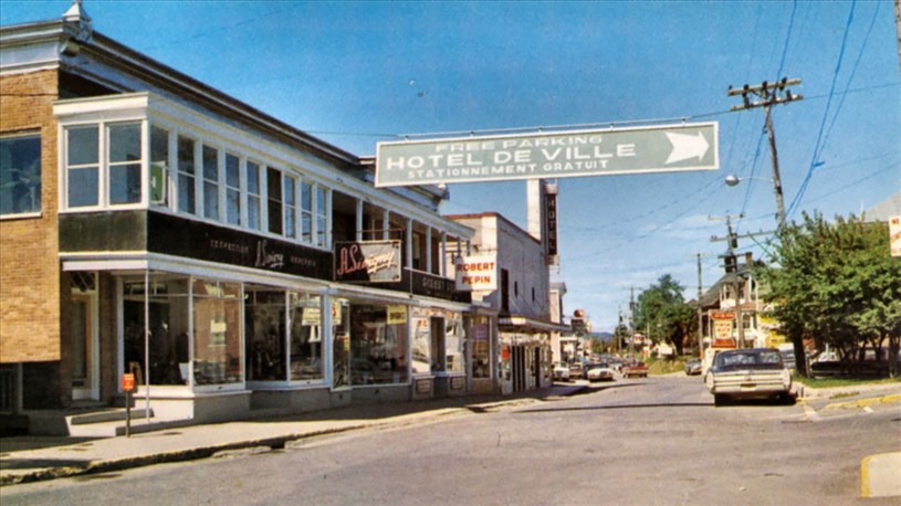 Une autre magnifique illustration du même secteur vers 1963 (photo 2). Ce sont les mêmes édifices, mais la photo a été prise en sens inverse, vers le nord. C'est le magasin Sévigny au premier plan, ensuite celui de Robert Pépin, mais le Théâtre St-Georges fut transformé en hôtel en 1949, donc c'était l'Hôtel Hermandi. Hélas, ces commerces furent tous incendiés lors du grand feu du 16 juillet 1965. Heureusement, d'autres apparaissant sur cette photo ont survécu. Ainsi, plus loin, on voit l'enseigne du Café Paris. À droite, l'enseigne du garage J. W. Morin, et, plus loin, l'enseigne Esso du Garage Drouin et frère.