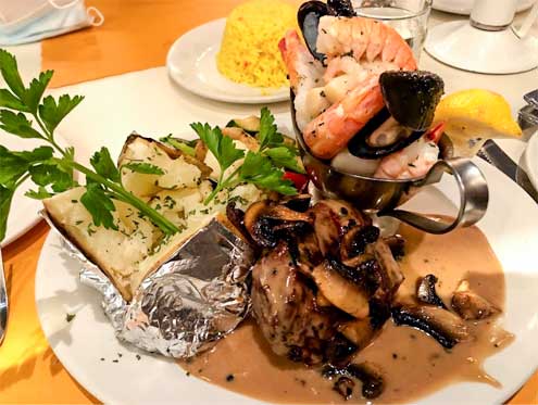 Croustade de crevettes au basilic | Ris de veau aux escargots sauce porto | Croquettes de chèvre et parmesan concassée de tomates aux herbes | Civet de lapin au vin blanc | Pavé de cerf vigneronne poellée de girolles | Poitrine de poulet en broche du Royal | Bouillabaisse méditerranéenne | Feuillantine de saumon jardinière à la ciboulette | Noisettes d’agneau à la fleur de thym | St-Honoré | Poirier aux 2 chocolats | Meringuée au citron | Et beaucoup plus !
